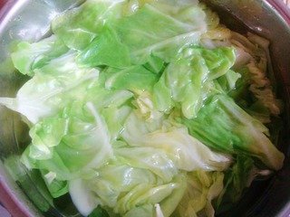 4、把卷心菜放入锅中淖一下,变色即可捞出来。